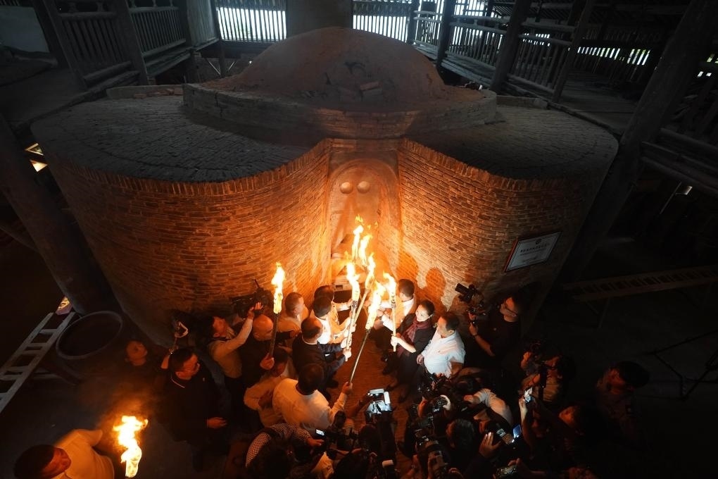 2023年10月19日,嘉賓與把樁師傅一起對葫蘆窯進(jìn)行復(fù)燒點(diǎn)火。當(dāng)日,作為2023中國景德鎮(zhèn)國際陶瓷博覽會的活動(dòng)之一,景德鎮(zhèn)古窯民俗博覽區(qū)對重建的明代葫蘆窯進(jìn)行點(diǎn)火復(fù)燒。同時(shí),景德鎮(zhèn)歷代瓷窯活態(tài)傳承紀(jì)實(shí)館開館。新華社記者 周密 攝