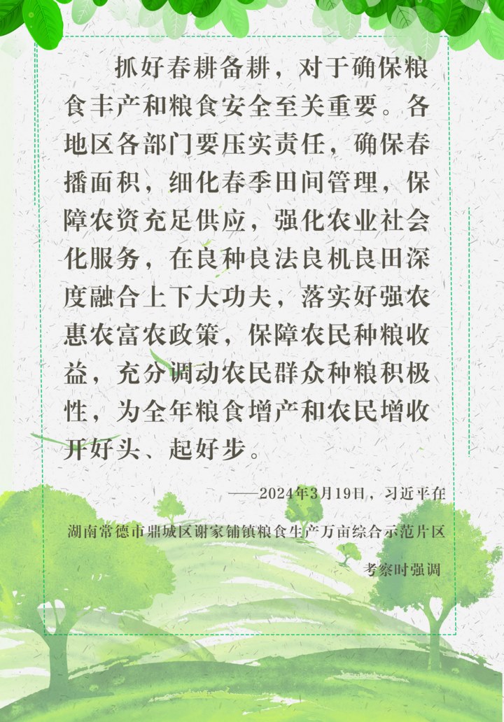 ??3月19日下午,習(xí)近平總書記來到湖南常德市鼎城區(qū)謝家鋪鎮(zhèn)糧食生產(chǎn)萬畝綜合示范片區(qū),走進(jìn)水稻田邊,察看秧苗培育和土地翻耕情況,并同種糧大戶、農(nóng)技人員、基層干部和村民親切交流,詳細(xì)詢問春耕備耕等情況。 ??“農(nóng)者,天下之本也。” ??在常德市鼎城區(qū)謝家鋪鎮(zhèn)港中坪村,農(nóng)民搶抓農(nóng)時,整備農(nóng)機(jī)、備足農(nóng)資,開展春耕生產(chǎn),播種豐收的希望。 ??3月19日,在港中坪村,村民駕駛農(nóng)機(jī)翻耕田地(無人機(jī)照片)。 ??3月19日,在港中坪村,村民駕駛農(nóng)機(jī)翻耕田地(無人機(jī)照片)。 ??3月19日,在港中坪村,村民駕駛農(nóng)機(jī)翻耕田地。 ??3月19日,在港中坪村,村民駕駛農(nóng)機(jī)翻耕田地。 ??3月19日,在港中坪村,村民駕駛農(nóng)機(jī)翻耕田地。 ??3月19日,在港中坪村,村民在疏通田間的水渠。 ??3月19日,在港中坪村,村民駕駛農(nóng)機(jī)翻耕田地。 ??監(jiān)制:郭建業(yè) ??策劃:賴向東 ??統(tǒng)籌:畢曉洋 徐亮 ??編輯:侯俊 李琰 張曼怡 杜瀟逸 ??攝影:鞠鵬 謝環(huán)馳 王曄 燕雁 薛宇舸 陳思汗 盧燁 ??新華社攝影部、湖南分社聯(lián)合制作 ??新華社第一工作室出品