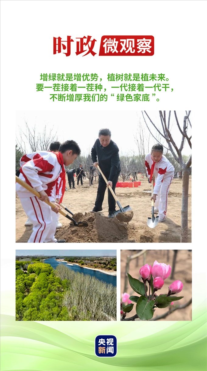 一次次揮鍬鏟土、培土圍堰、提水澆灌,總書記身體力行、率先垂范,就是要號(hào)召大家都行動(dòng)起來(lái),積極參與植樹造林,人人爭(zhēng)當(dāng)綠色使者、生態(tài)先鋒,為建設(shè)美麗中國(guó)增綠添彩,共同譜寫人與自然和諧共生的中國(guó)式現(xiàn)代化新篇章。