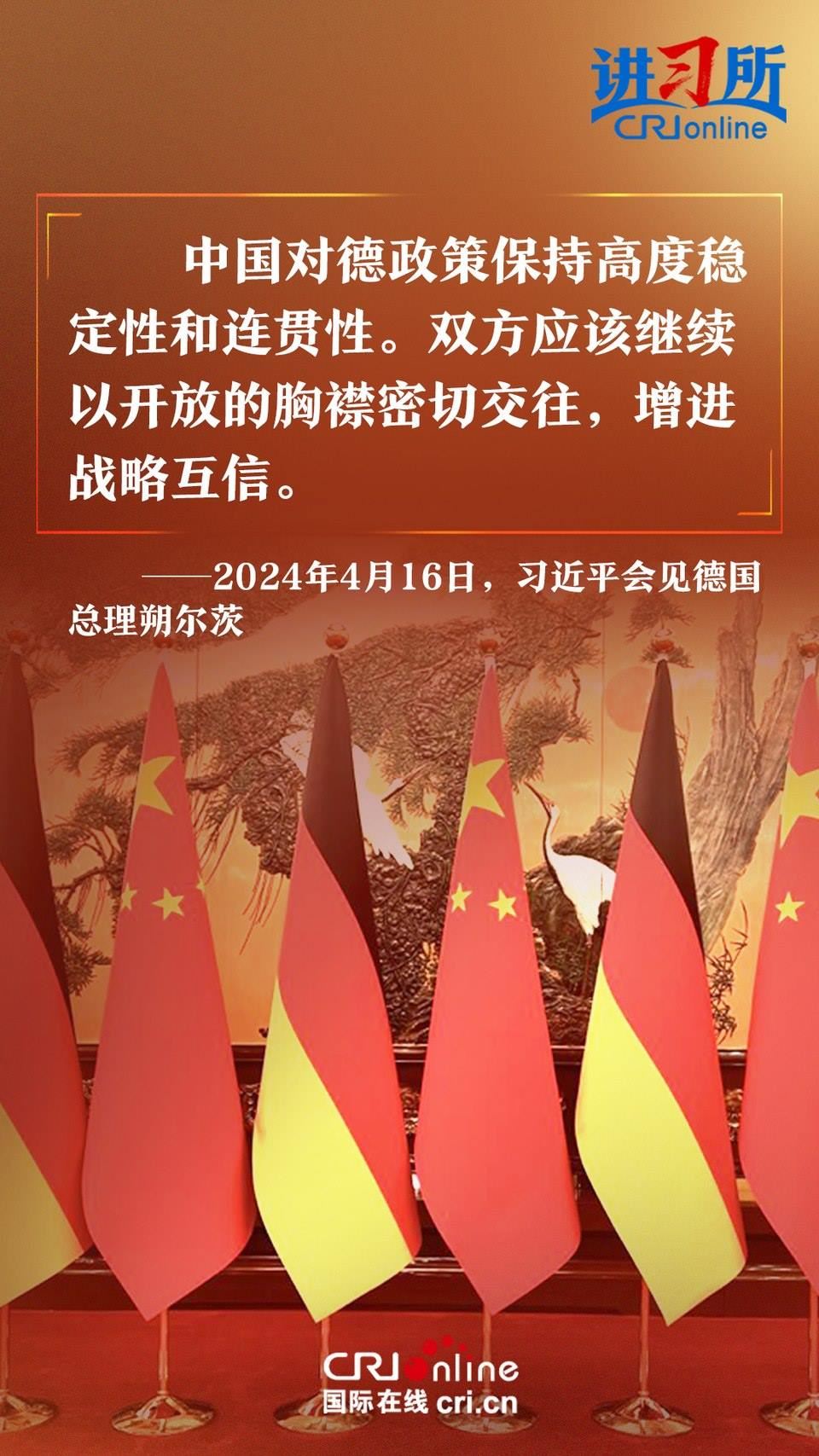 4月16日上午,中國(guó)國(guó)家主席習(xí)近平在北京釣魚(yú)臺(tái)國(guó)賓館會(huì)見(jiàn)了德國(guó)總理朔爾茨。習(xí)近平指出,中德合作對(duì)雙方有利,對(duì)世界有利。世界越是動(dòng)蕩,雙方越要提升兩國(guó)關(guān)系的韌性和活力。中德是世界第二、第三大經(jīng)濟(jì)體,鞏固和發(fā)展中德關(guān)系的意義超越雙邊關(guān)系范疇,對(duì)亞歐大陸乃至整個(gè)世界都有重要影響。兩國(guó)要從長(zhǎng)遠(yuǎn)和戰(zhàn)略角度看待和發(fā)展雙邊關(guān)系,攜手為世界注入更多穩(wěn)定性和確定性。
