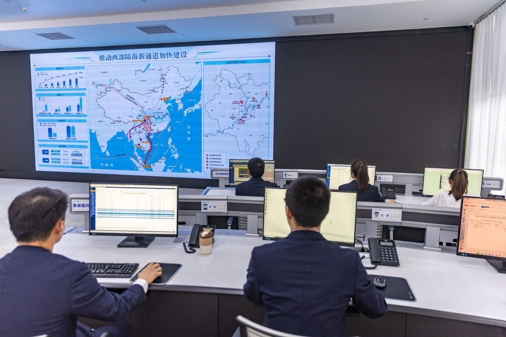 2024年4月22日,工作人員在西部陸海新通道運營調(diào)度中心工作。工作人員可以在大屏上實時了解班列在邊境口岸的出入境信息。