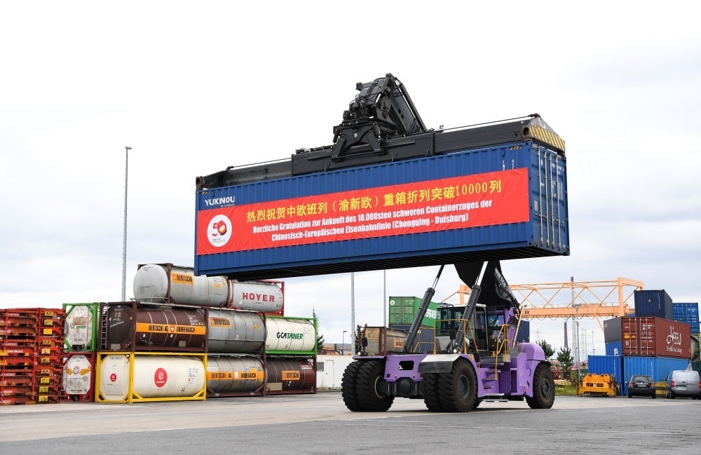 2022年7月11日,中歐班列(重慶)第10000列重箱折列抵達德國杜伊斯堡,這是接車儀式現(xiàn)場。