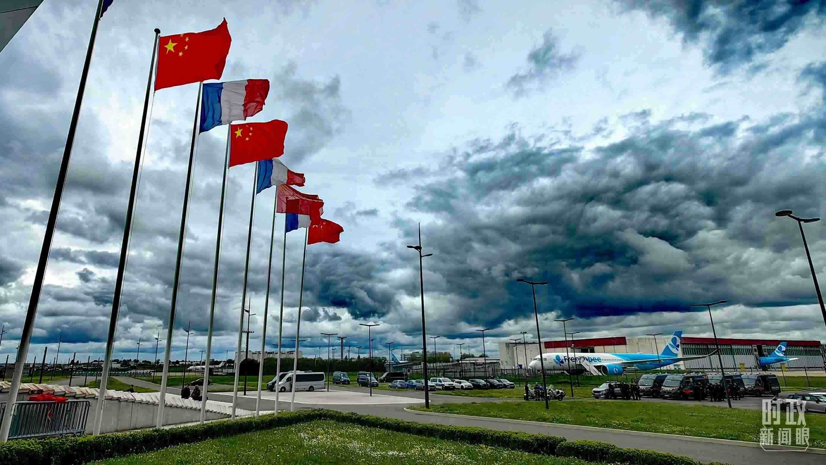 △巴黎奧利機(jī)場,中法兩國國旗迎風(fēng)招展。(總臺(tái)央視記者段德文拍攝)