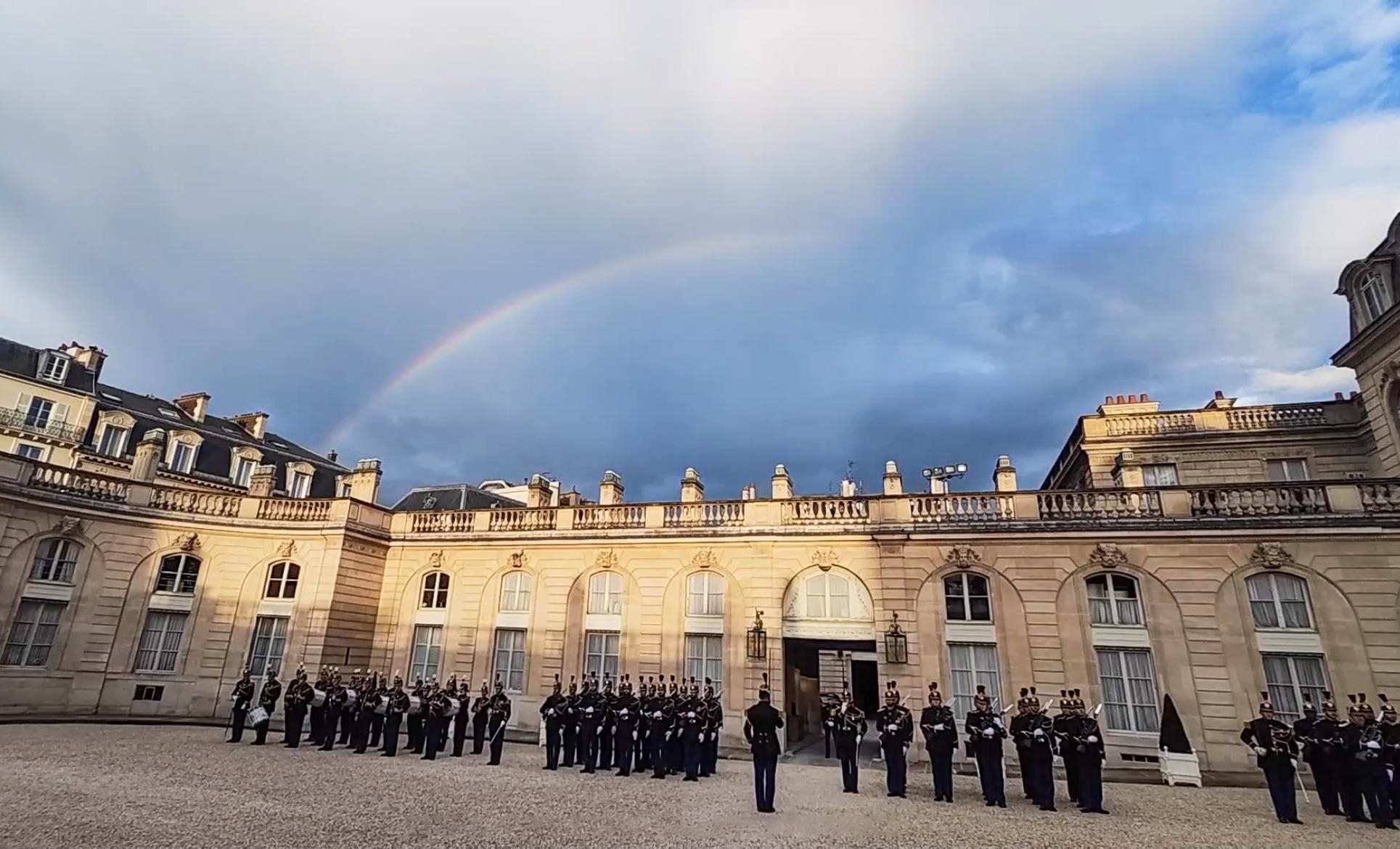 當?shù)貢r間5月6日晚,習近平主席在巴黎出席馬克龍總統(tǒng)舉行的盛大歡迎宴會。宴會前,愛麗舍宮上空出現(xiàn)彩虹。彩虹連接著東西方。塞納河畔,正寫下中法兩國“雙向奔赴”的新故事。