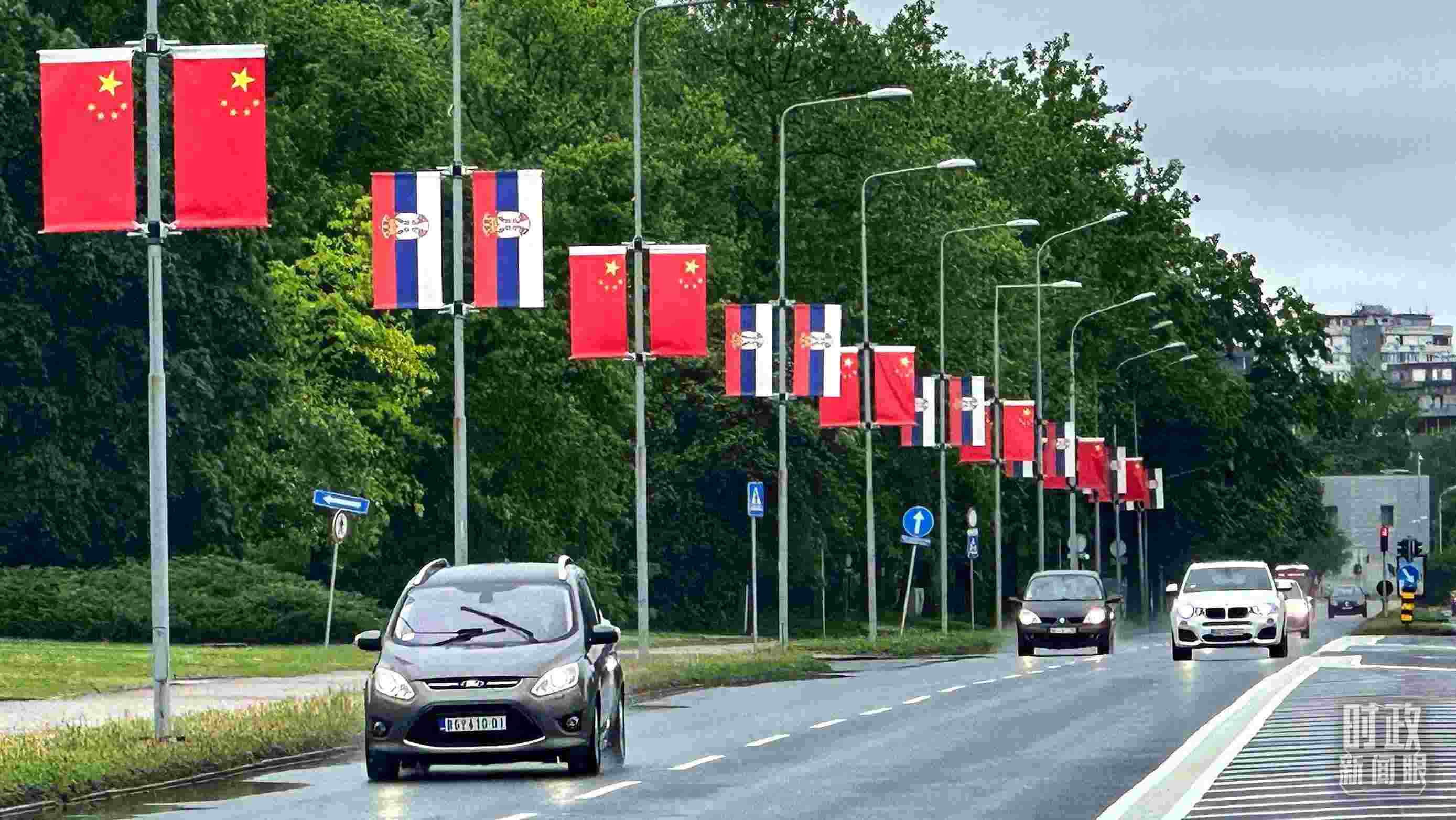 △貝爾格萊德的主要街道掛滿五星紅旗,隨風(fēng)飄揚。(總臺央視記者范一鳴拍攝)