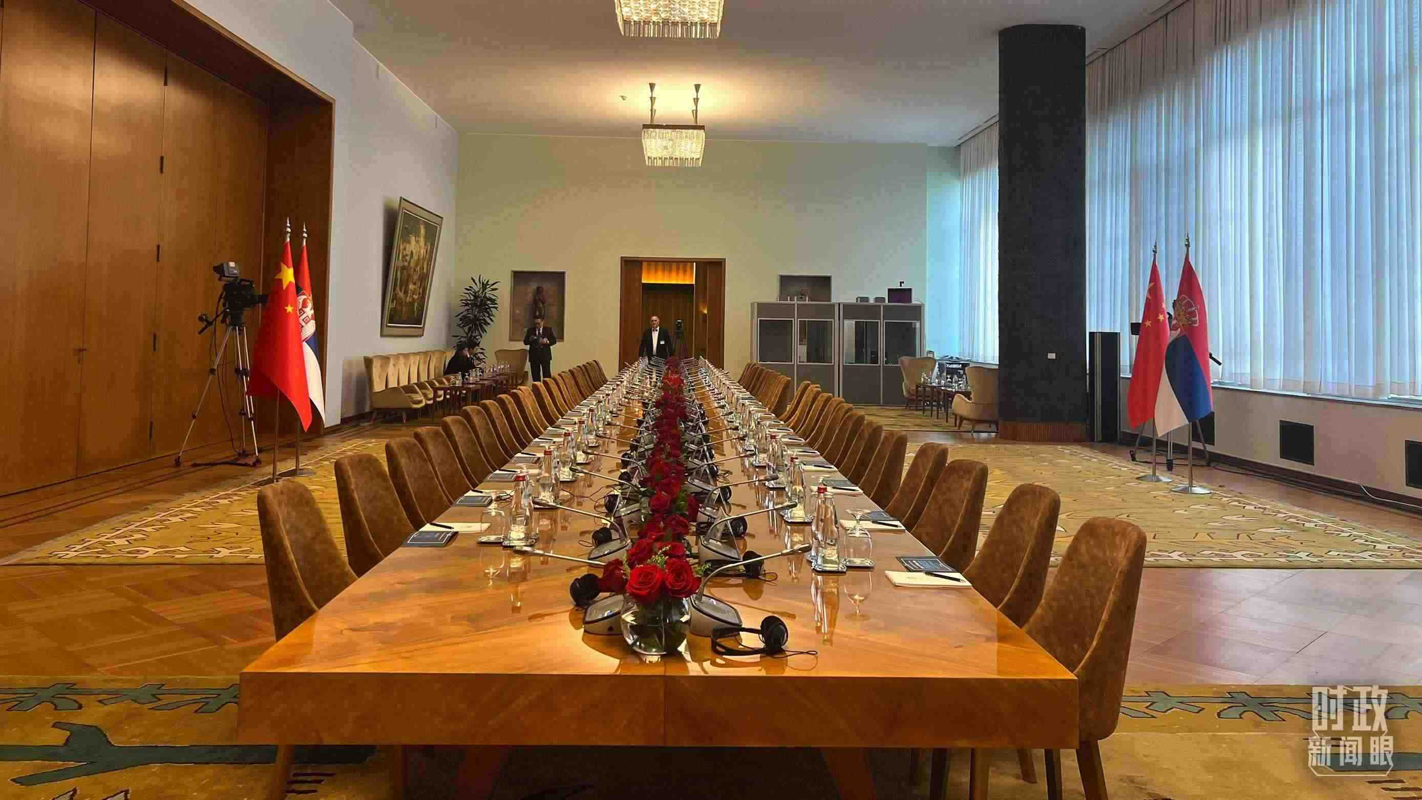 △5月8日上午,習(xí)主席同武契奇總統(tǒng)舉行大范圍會談,這是會談開始前的現(xiàn)場。(總臺央視記者張洛嘉拍攝)