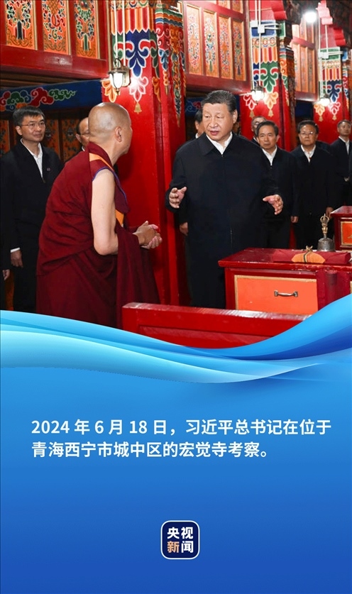 6月18日,正在青??疾斓牧?xí)近平總書記來(lái)到位于西寧市城中區(qū)的宏覺寺。在寺前院落,宏覺寺民主管理委員會(huì)負(fù)責(zé)人向總書記敬獻(xiàn)哈達(dá),僧人提香爐、持寶傘迎接總書記。