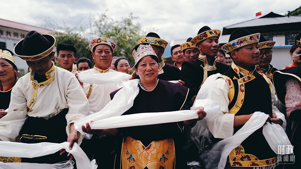 △2021年7月,習(xí)近平總書記來(lái)到西藏林芝市嘎拉村考察。村民們手捧哈達(dá),熱情迎接。(總臺(tái)央視記者彭漢明拍攝)