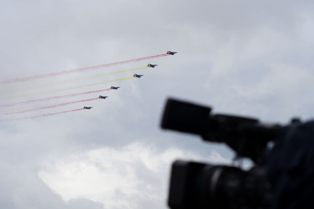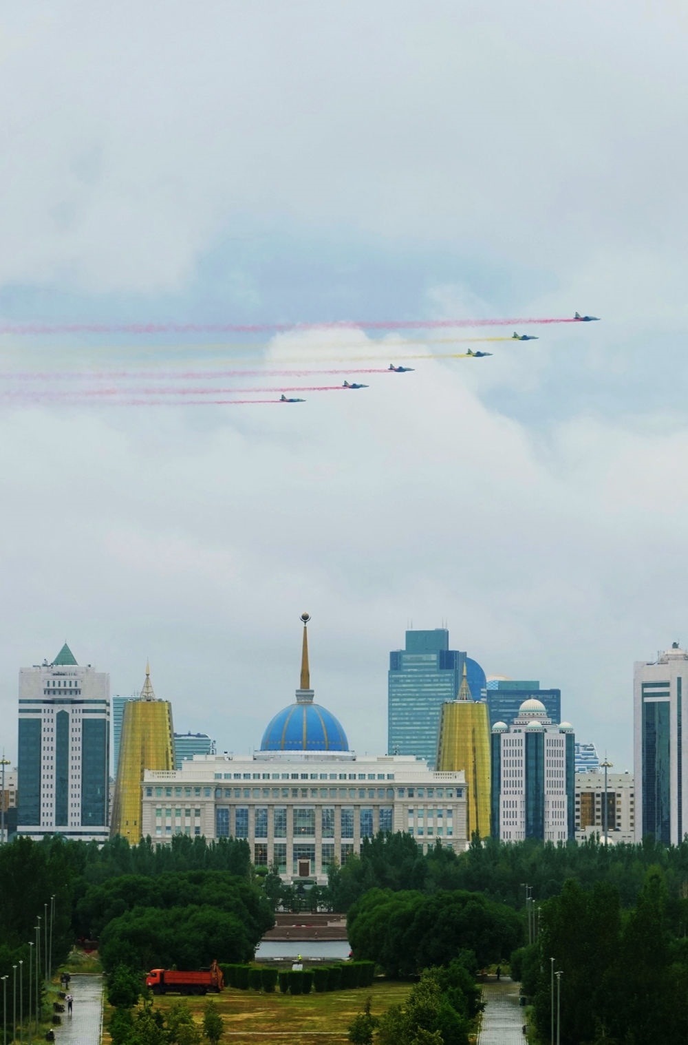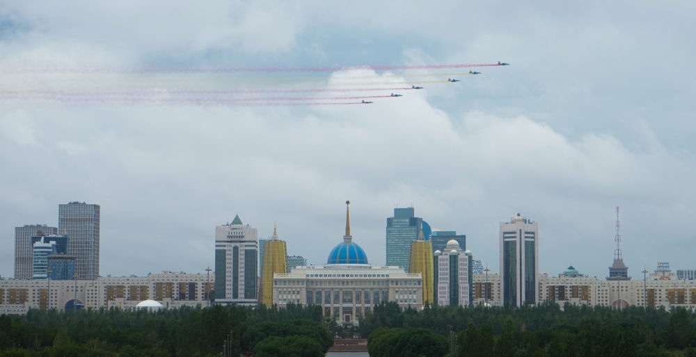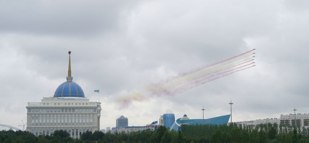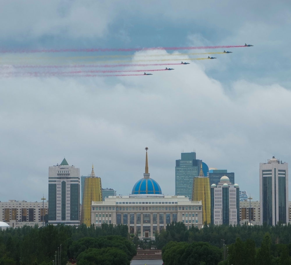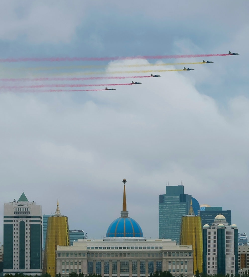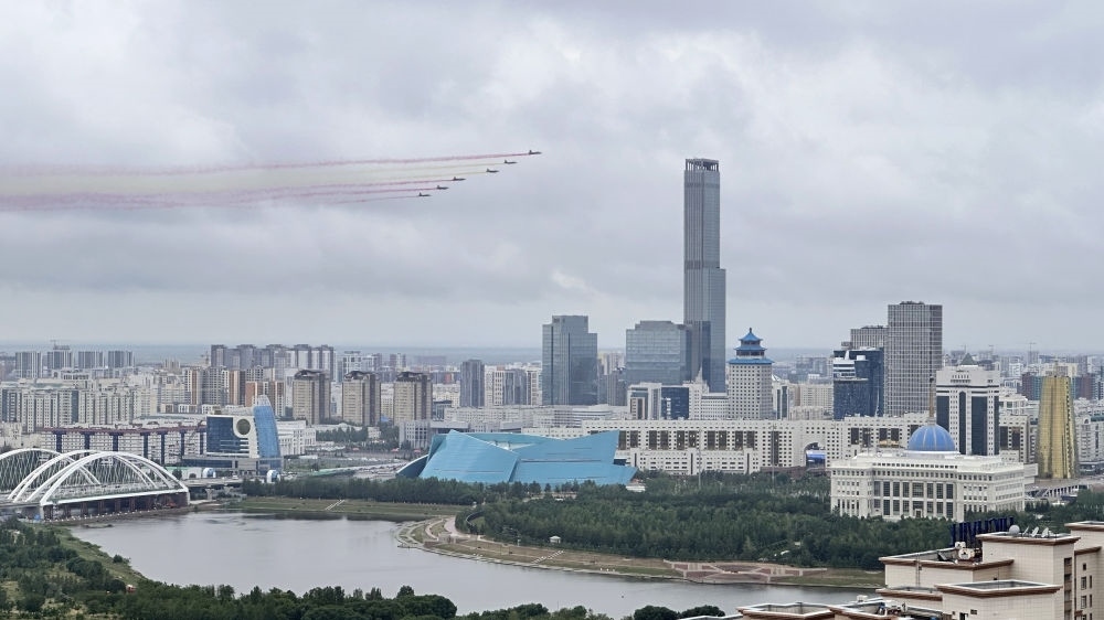 習(xí)近平主席抵達(dá)時,哈方多架戰(zhàn)機在總統(tǒng)府上空拉出中國國旗色彩煙歡迎中國貴賓。