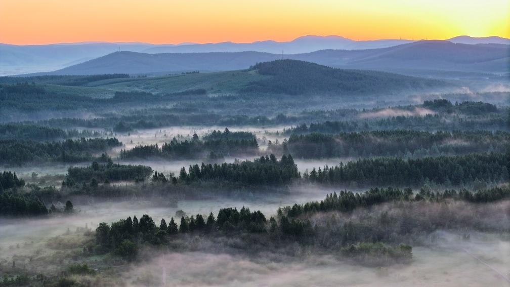 7月5日清晨,位于河北省承德市的塞罕壩國家森林公園雨后晨霧飄渺、滿目青翠(無人機(jī)照片)。