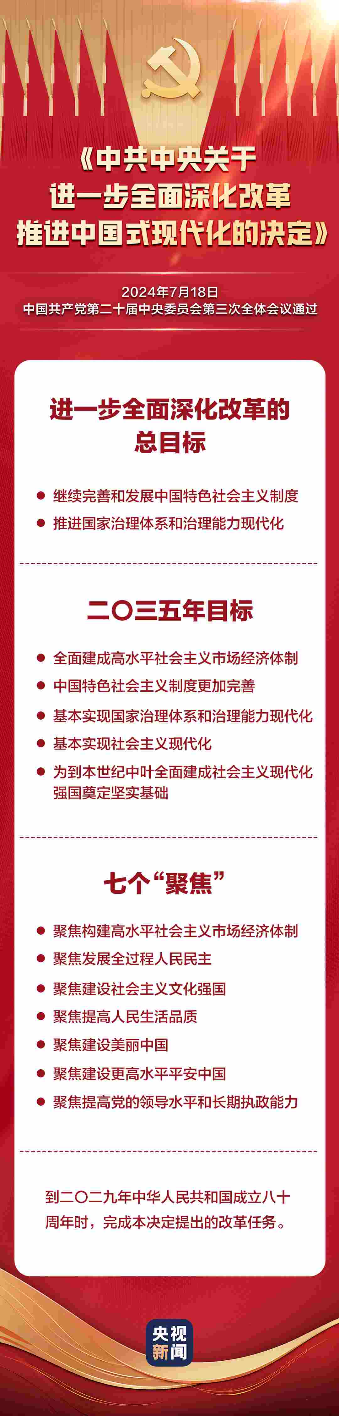 中國共產黨第二十屆中央委員會第三次全體會議,于2024年7月15日至18日在北京舉行。全會最重要的成果是審議通過《中共中央關于進一步全面深化改革、推進中國式現(xiàn)代化的決定》。《決定》共15部分、60條,分三大板塊,一文速覽: