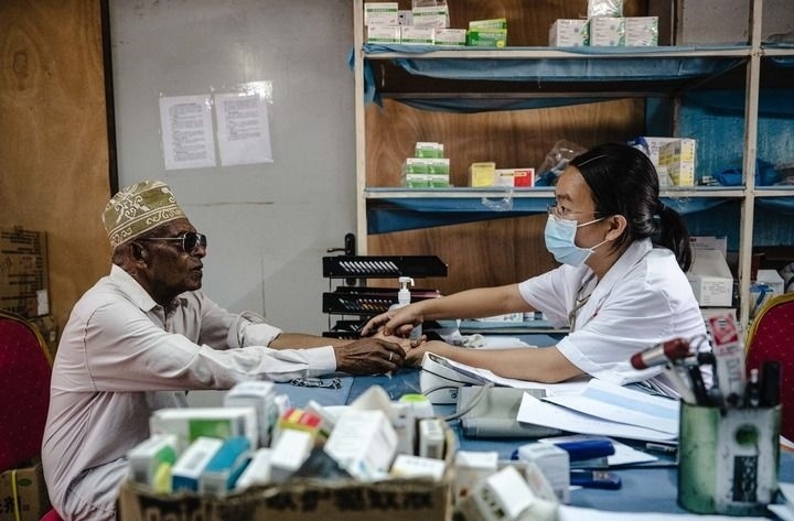 2024年1月11日,中國第15批援科摩羅醫(yī)療隊隊長潘春熹在位于科摩羅首都莫羅尼的馬魯夫醫(yī)院內(nèi)為患者看病。新華社記者 王冠森 攝