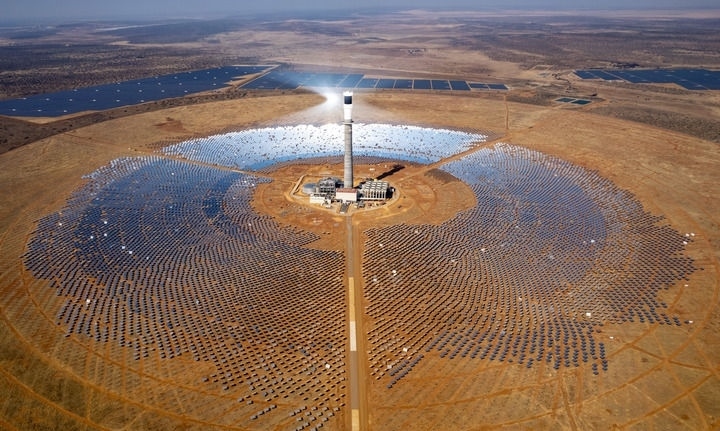 這是2024年8月20日在南非北開普省拍攝的南非紅石100兆瓦塔式熔鹽光熱電站項目(無人機照片)。由中國電建集團山東電建三公司承建的南非紅石100兆瓦塔式熔鹽光熱電站項目是撒哈拉以南非洲首個塔式熔鹽光熱電站項目,也是南非最大可再生能源投資項目之一。新華社記者 張譽東 攝