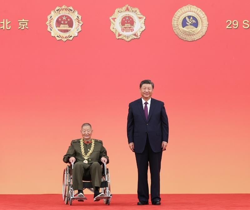 △2024年9月29日,國家勛章和國家榮譽稱號頒授儀式上,習(xí)近平總書記向“共和國勛章”獲得者黃宗德頒授勛章后合影。