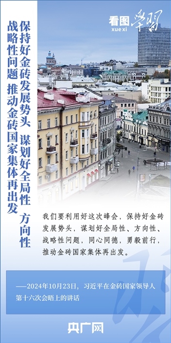 當?shù)貢r間10月23日,國家主席習(xí)近平在俄羅斯喀山出席金磚國家領(lǐng)導(dǎo)人第十六次會晤并發(fā)表重要講話。習(xí)主席深刻闡述推動“大金磚合作”高質(zhì)量發(fā)展的中國主張,就金磚大家庭發(fā)展合作提出五點務(wù)實舉措,表達了中方愿同金磚各國一道,攜手更多“全球南方”國家共同推動構(gòu)建人類命運共同體的真誠愿望。一起來學(xué)習(xí)!