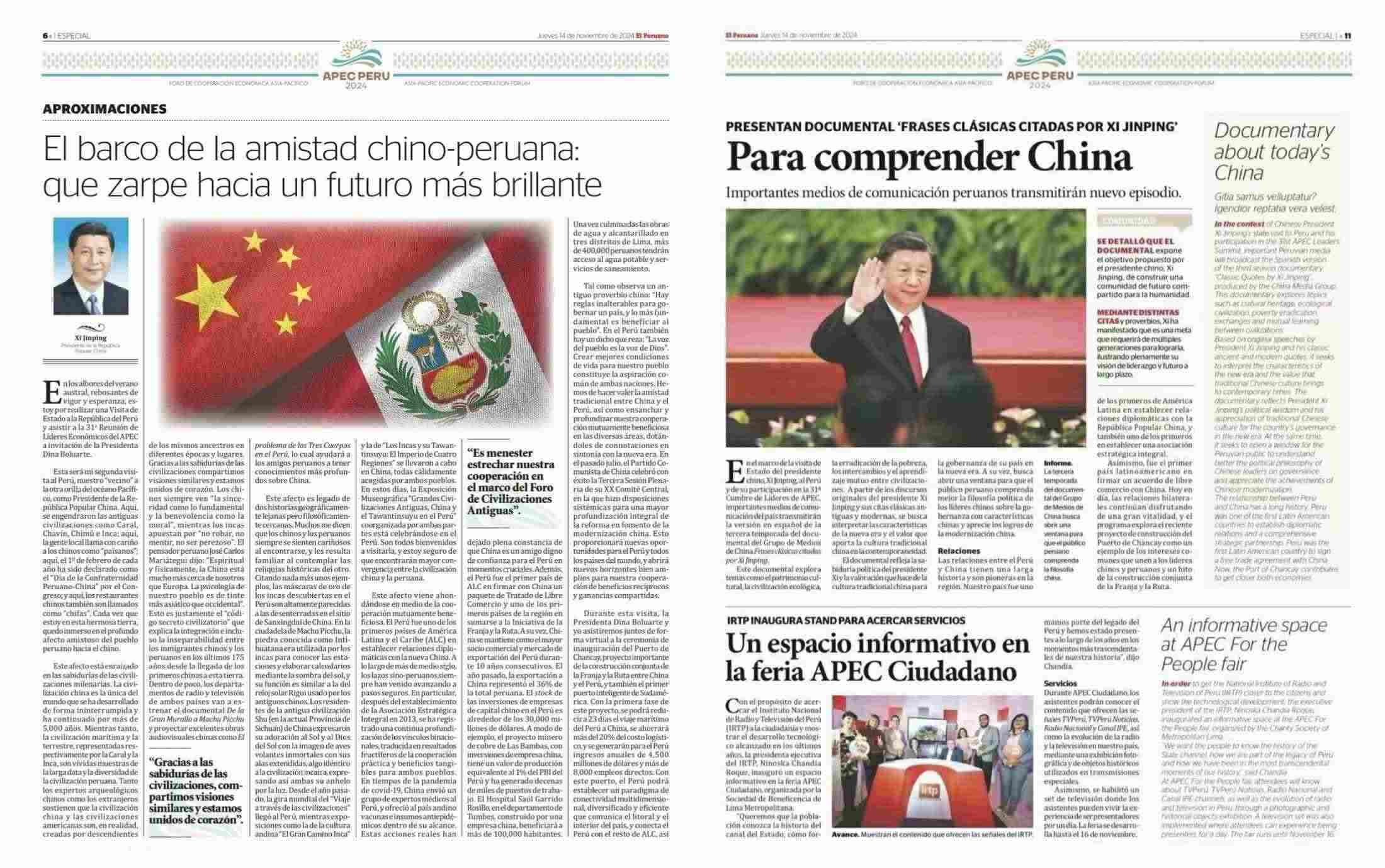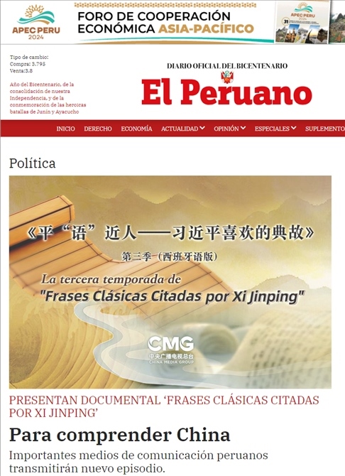 在中國國家主席習近平應秘魯共和國總統(tǒng)博魯阿爾特邀請,赴利馬出席亞太經(jīng)合組織第三十一次領導人非正式會議并對秘魯進行國事訪問之際,由中國中央廣播電視總臺制作的《平“語”近人——習近平喜歡的典故》第三季(西班牙語版),將于當?shù)貢r間11月14日起在秘魯國家廣播電視臺、秘魯電視聯(lián)播網(wǎng)、秘魯廣播節(jié)目集團電視端等多平臺落地播出。當?shù)囟嗉抑髁髅襟w對節(jié)目落播進行預告,引發(fā)秘魯各界普遍期待和廣泛關注。