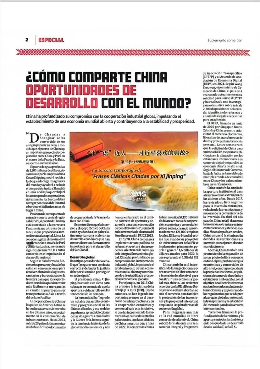 11月14日,秘魯最具影響力的官方報紙《秘魯人報》刊發(fā)節(jié)目在秘魯落播的消息。文章指出,《平“語”近人——習近平喜歡的典故》第三季展現(xiàn)了中華民族開放包容、兼收并蓄的文化胸懷,闡釋了習近平主席提出的推動構建人類命運共同體的這一重大理念,是對“建設一個什么樣的世界、怎樣建設這個世界”給出的中國方案?!睹佤斎藞蟆诽乜婵l(fā)《平“語”近人——習近平喜歡的典故》第三季(西班牙語版)將在秘魯主流媒體落播特稿?!睹佤斎藞蟆饭倬W(wǎng)也同步刊發(fā)了節(jié)目預告消息和海報。
