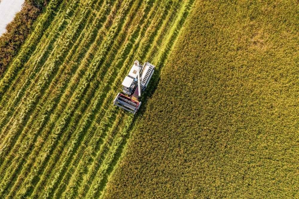 2024年10月25日,收割機(jī)在浙江省湖州市吳興區(qū)東林鎮(zhèn)保國村的稻田里作業(yè)(無人機(jī)照片)。新華社記者 徐昱 攝