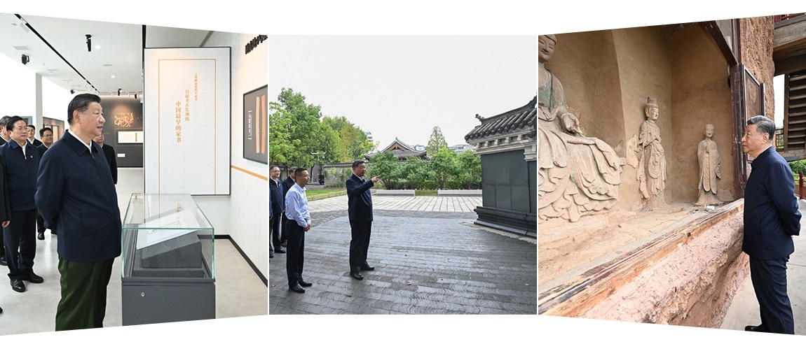 △ 自左向右分別為:2024年11月4日,習近平總書記在湖北孝感云夢縣博物館參觀出土秦漢簡牘展;2024年10月17日,習近平總書記在安徽桐城六尺巷考察;2024年9月11日,習近平總書記在甘肅天水麥積山石窟考察。