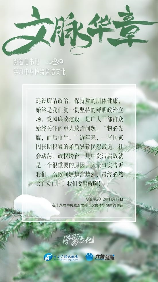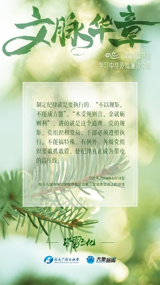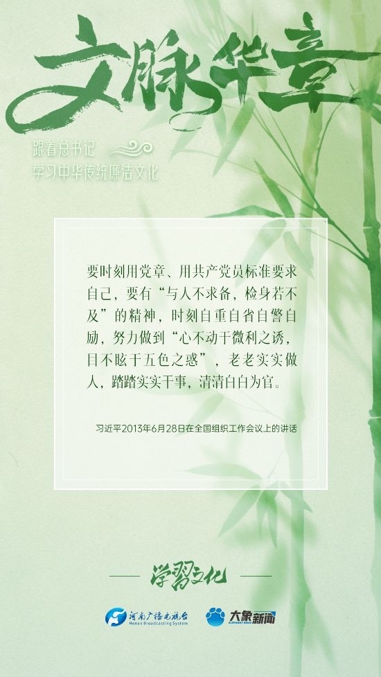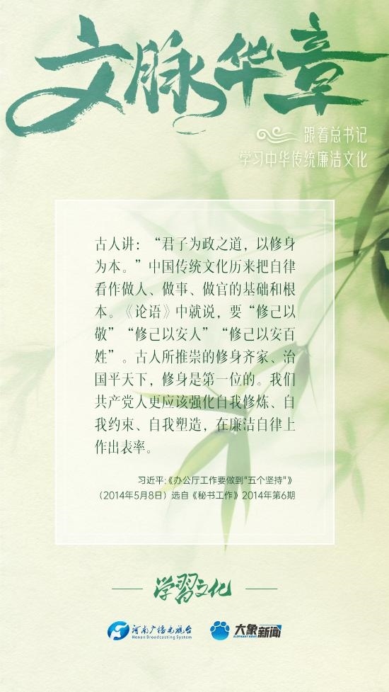 中華優(yōu)秀傳統(tǒng)文化蘊(yùn)含著豐富的廉潔文化,習(xí)近平總書(shū)記曾指出:沒(méi)有中華優(yōu)秀傳統(tǒng)文化、革命文化、社會(huì)主義先進(jìn)文化的底蘊(yùn)和滋養(yǎng),信仰信念就難以深沉而執(zhí)著。總書(shū)記常常引經(jīng)據(jù)典,教育引導(dǎo)廣大黨員干部正心修身,涵養(yǎng)文化,守住為政之本。大象新聞分五期為您梳理,我們一起跟著總書(shū)記學(xué)習(xí)中華傳統(tǒng)廉潔文化。今天推出第五期。