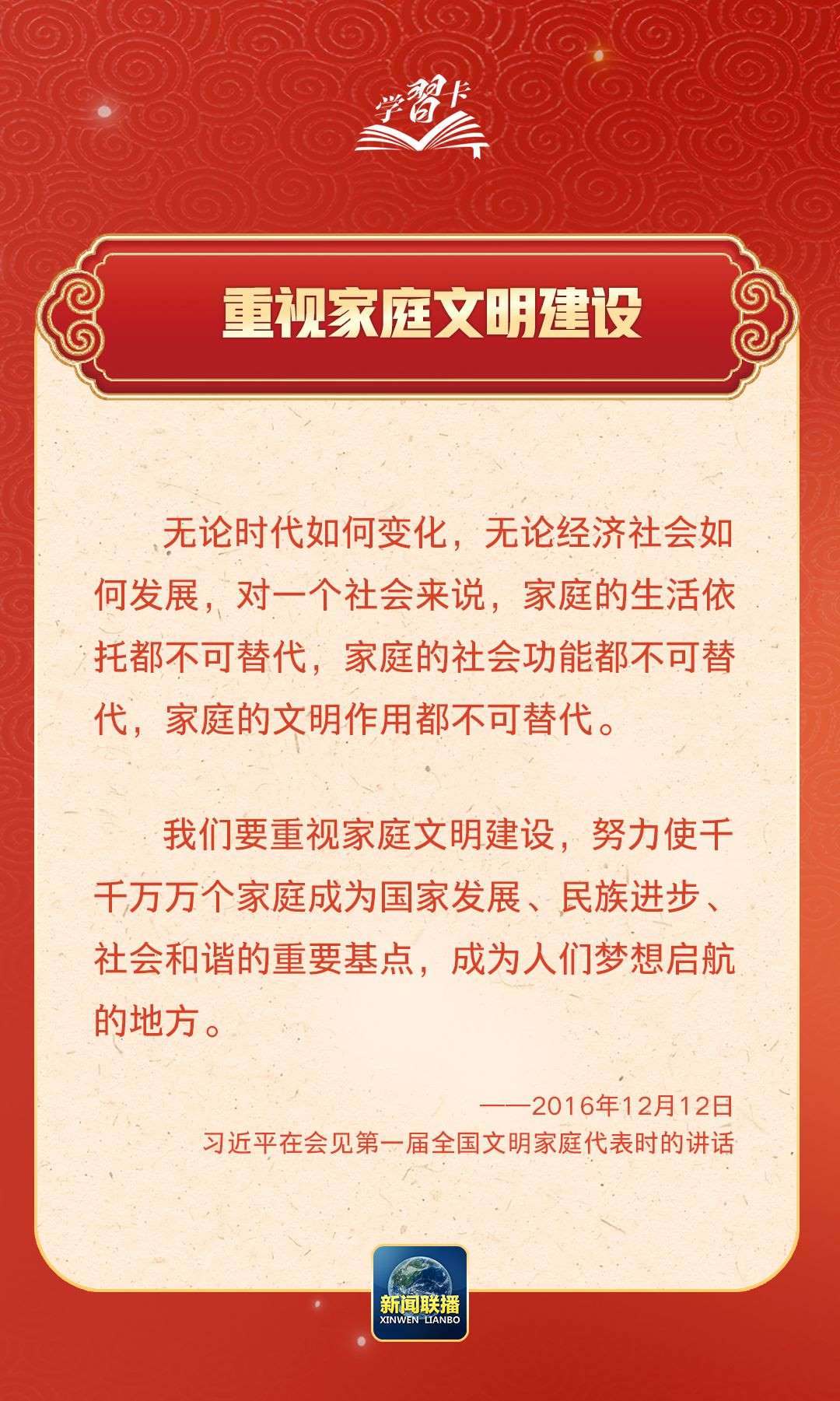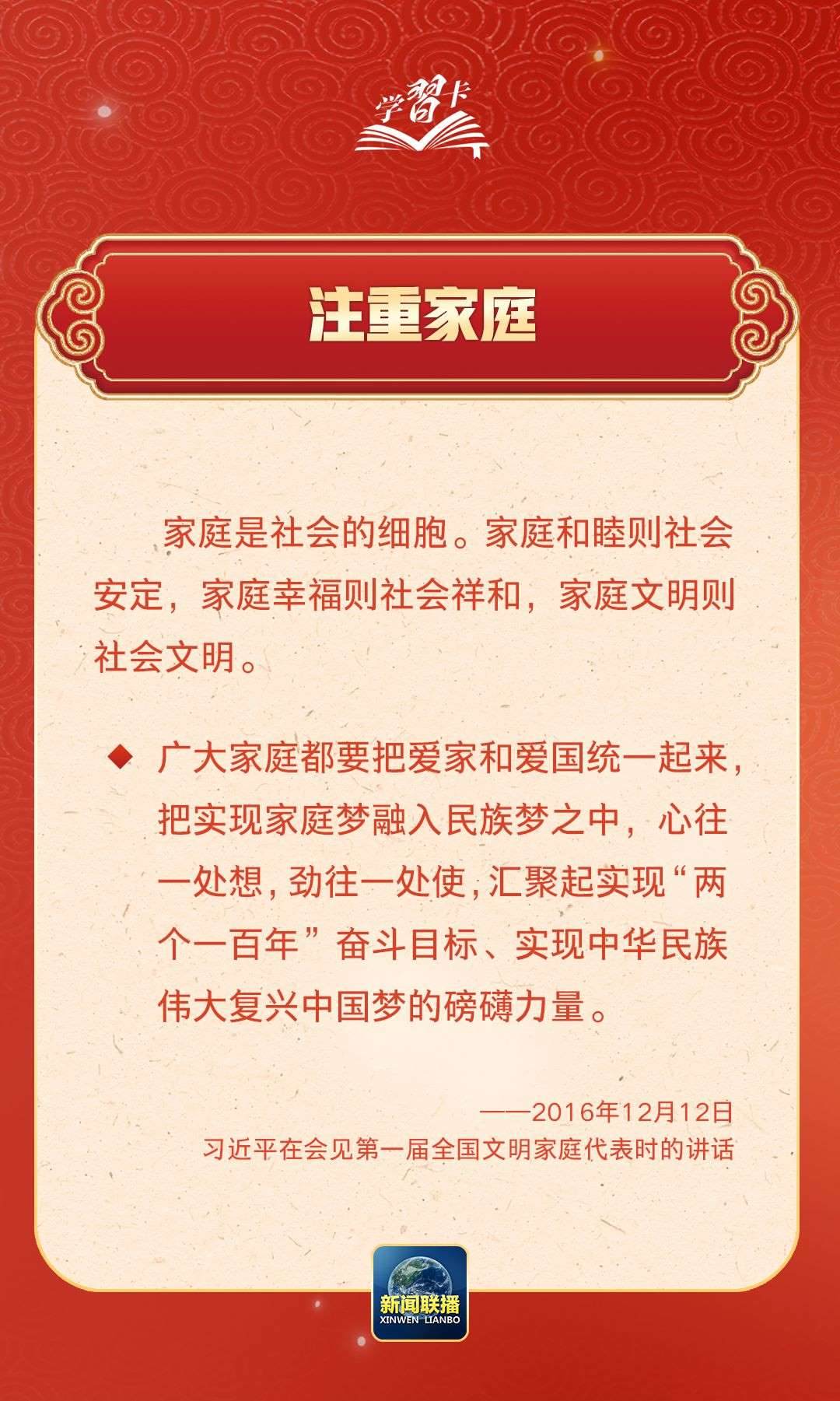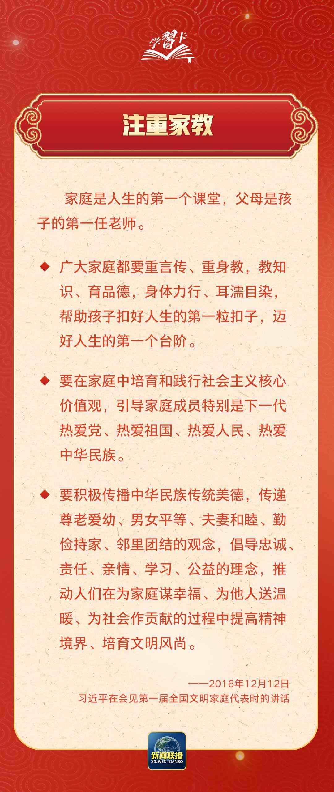 在習(xí)近平總書記心中,家國的分量很重。他多次強(qiáng)調(diào)要重視家庭建設(shè),提倡愛家愛國相統(tǒng)一,指出廣大家庭都要弘揚(yáng)優(yōu)良家風(fēng),以千千萬萬家庭的好家風(fēng)支撐起全社會(huì)的好風(fēng)氣。近日,《求是》雜志發(fā)表習(xí)近平總書記重要文章《注重家庭,注重家教,注重家風(fēng)》,一起學(xué)習(xí)↓