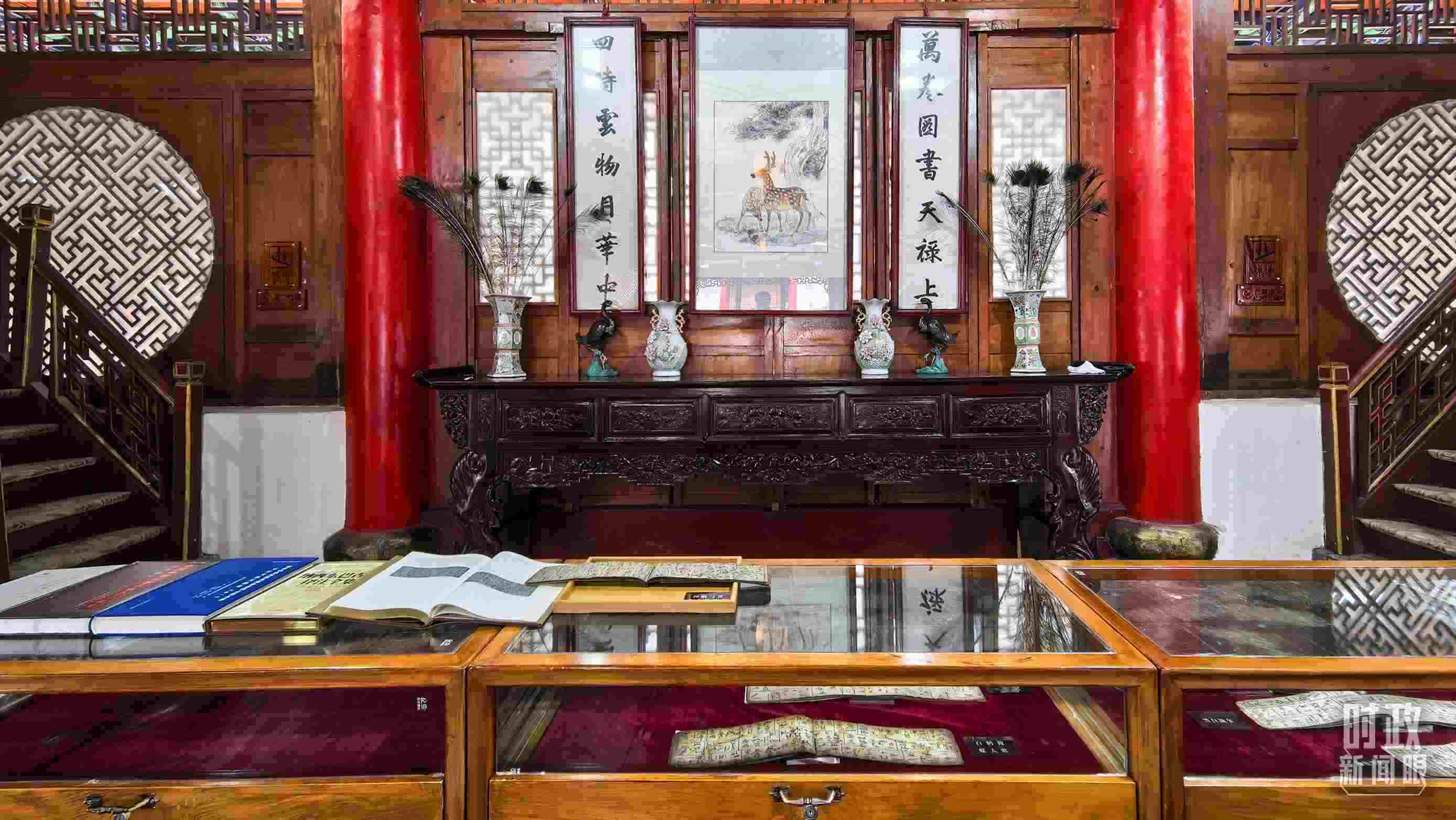 △木府萬卷樓里的書籍和文物展陳。(總臺(tái)央視記者陸泓宇拍攝)