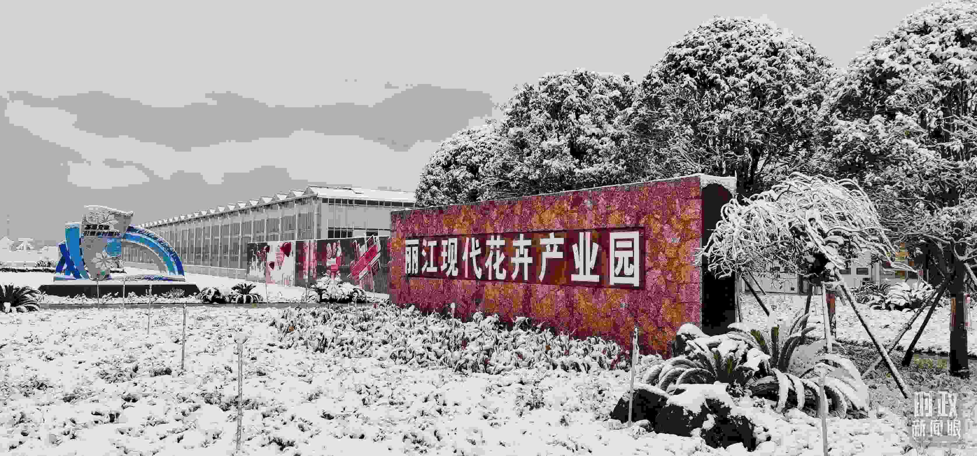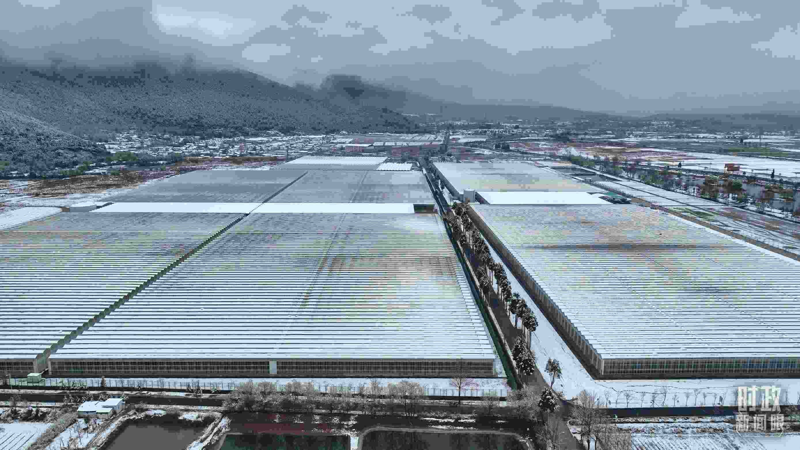 △銀裝素裹的麗江現(xiàn)代花卉產(chǎn)業(yè)園。(總臺(tái)央視記者郭鴻拍攝)
