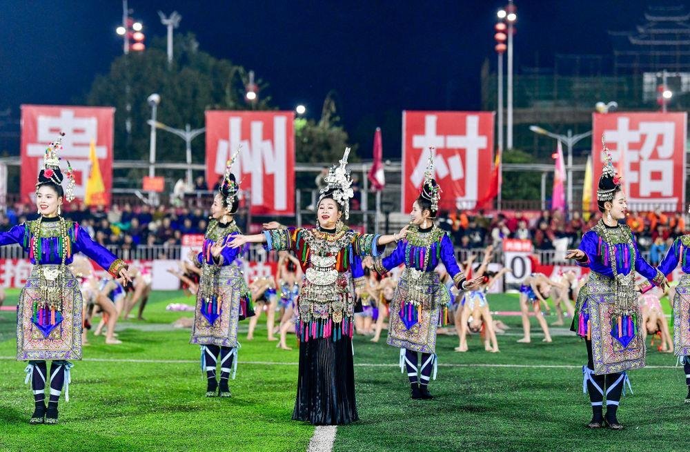 △2025年3月14日,2025年貴州“村超”40強(qiáng)交叉賽在榕江“村超”足球場舉行,演員在比賽間隙表演侗族大歌。