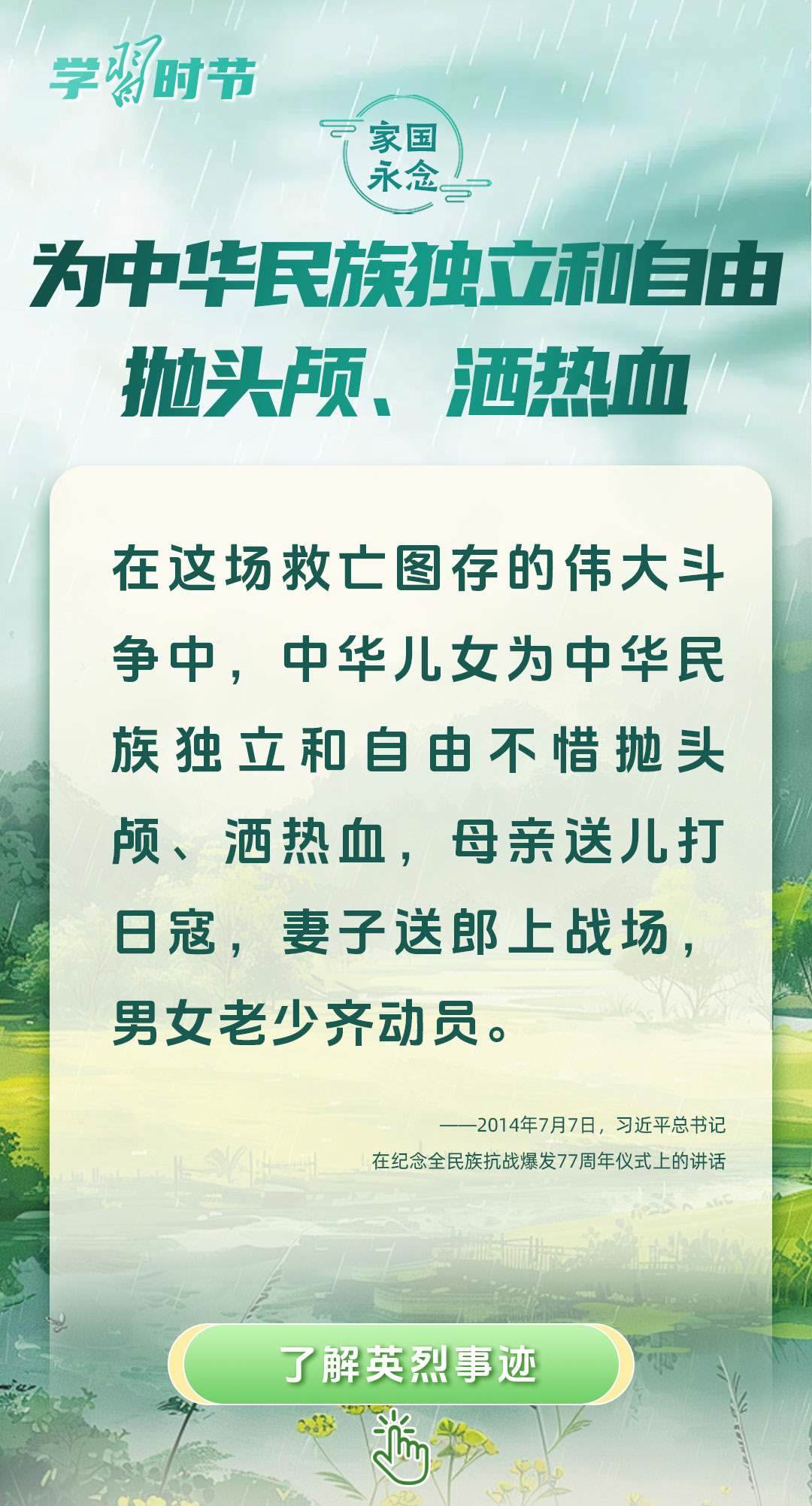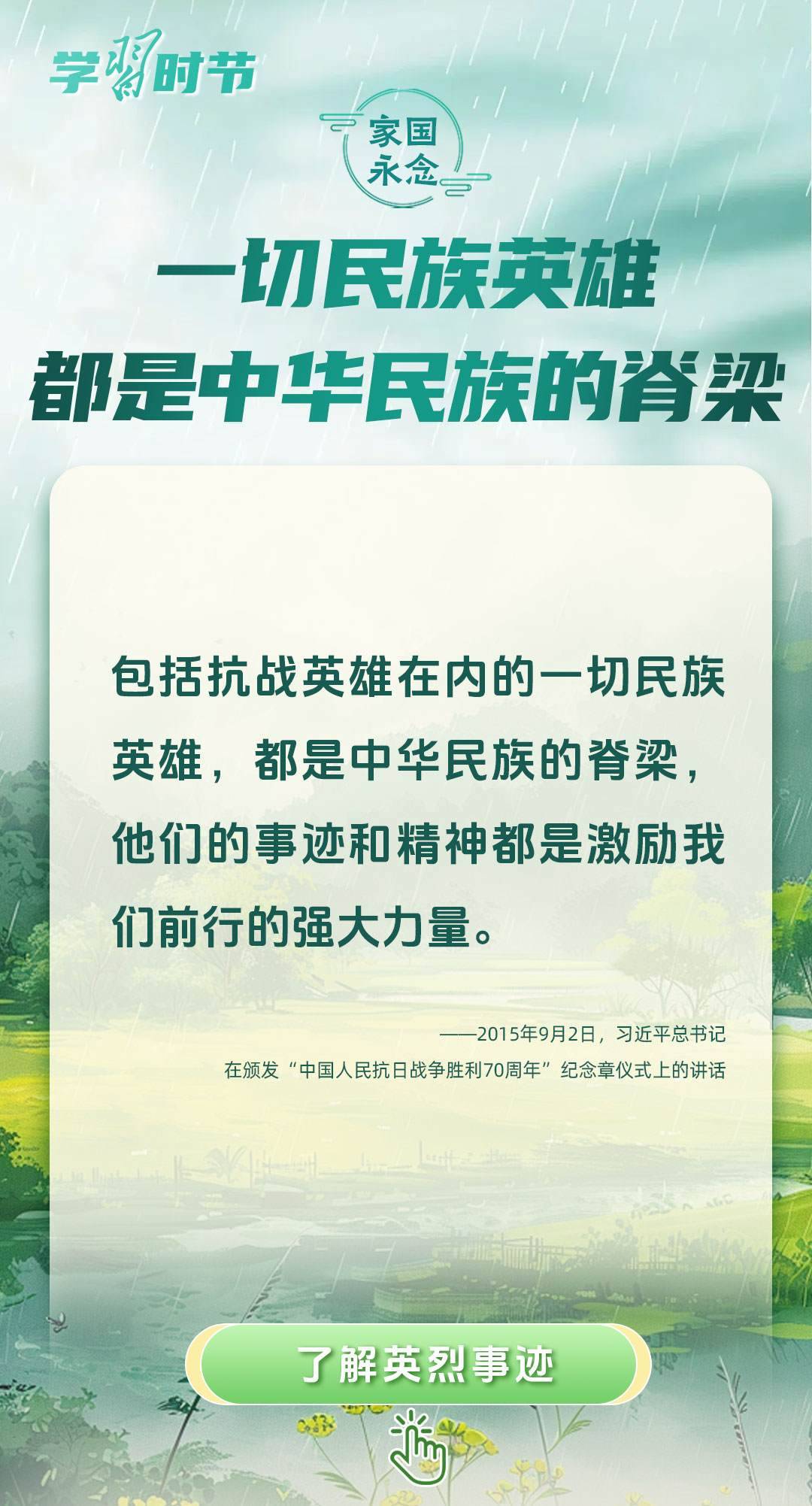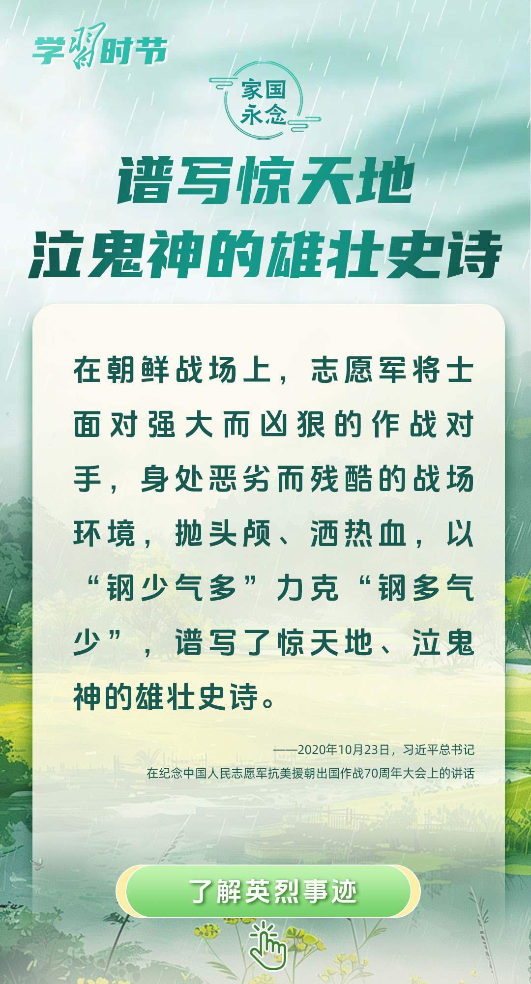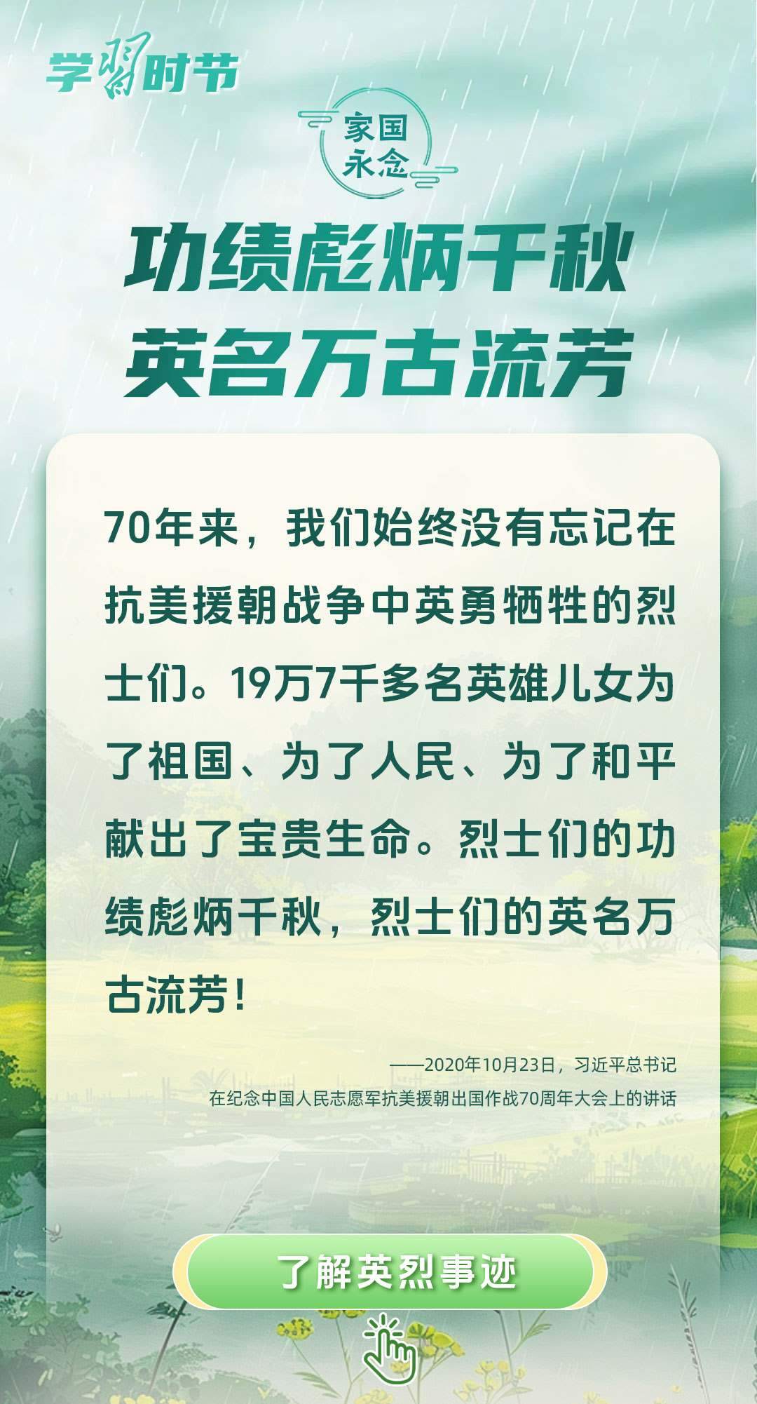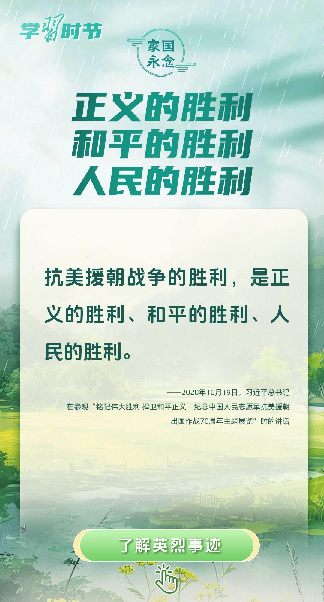 今年是中國人民抗日戰(zhàn)爭暨世界反法西斯戰(zhàn)爭勝利80周年、中國人民志愿軍抗美援朝出國作戰(zhàn)75周年。習(xí)近平總書記曾說:“對一切為國家、為民族、為和平付出寶貴生命的人們,不管時代怎樣變化,我們都要永遠銘記他們的犧牲和奉獻。”今天我們所擁有的一切,無不凝結(jié)著英雄、英烈們的奉獻付出乃至巨大犧牲。