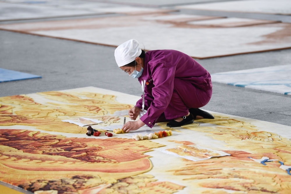 青海湖畔翱翔的水鳥、雪山下起舞的藏族女孩……在圣源地毯集團(tuán)有限公司車間內(nèi),手持電織槍的女工們,正按照設(shè)計圖織出精美立體的圖案。