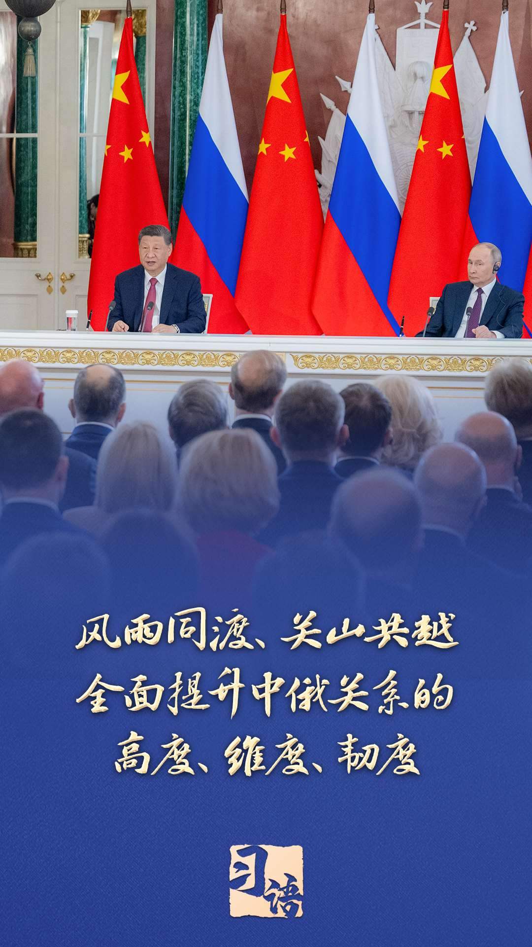 “面對變亂交織的國際形勢,中俄兩國要堅定秉持永久睦鄰友好、全面戰(zhàn)略協(xié)作、互利合作共贏精神,風(fēng)雨同渡、關(guān)山共越,全面提升中俄關(guān)系的高度、維度、韌度,為世界和平和安全注入更多穩(wěn)定性,為全球發(fā)展繁榮提供更強(qiáng)推動力?!碑?dāng)?shù)貢r間5月8日,習(xí)近平在同俄羅斯總統(tǒng)普京共同會見記者時指出。