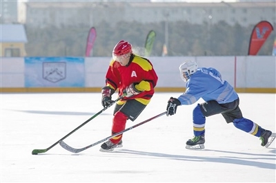 在呼和浩特市一冰場內,球員在冰球比賽中拼搶。記者 于濤 攝