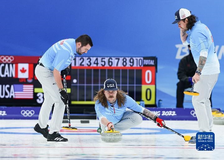2月18日,美國隊選手馬特·漢密爾頓(中)在冰壺男子銅牌賽比賽中擲壺。新華社記者王婧嬙攝