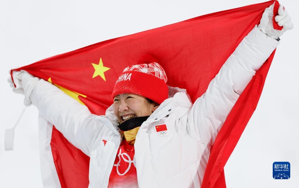 2月18日,冠軍中國隊選手谷愛凌在自由式滑雪女子U型場地技巧獎牌頒發(fā)儀式上。新華社記者薛玉斌攝