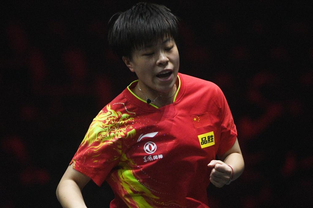 3月17日,中國(guó)選手王藝迪在女單四分之一決賽比賽中慶祝得分。