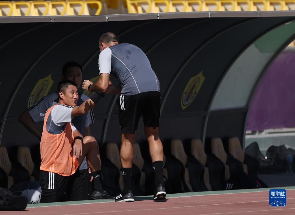 11月18日,中國(guó)裁判馬寧(右)在訓(xùn)練中與球員致意。新華社記者 潘昱龍 攝