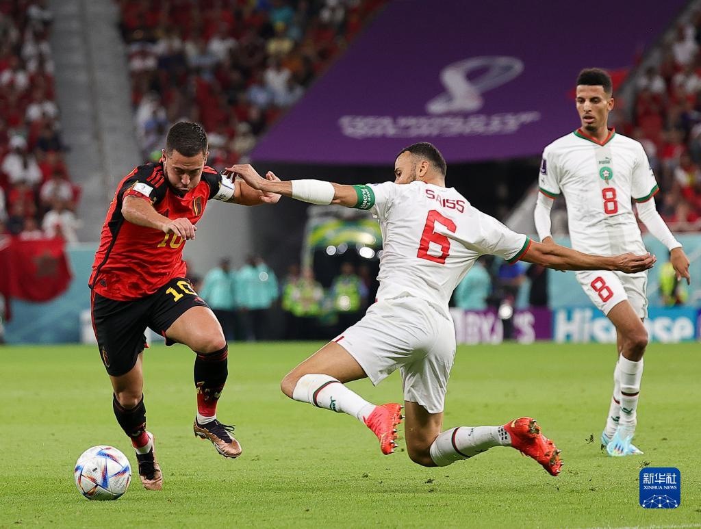 11月27日,摩洛哥隊球員賽斯(中)與比利時隊球員阿扎爾拼搶。新華社記者 王東震 攝