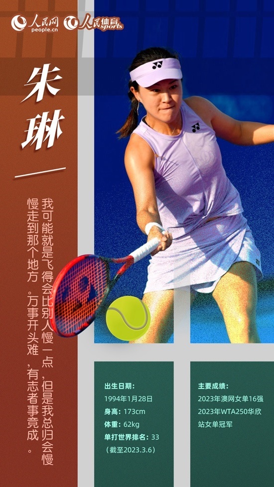 今年年初,29歲的朱琳給自己定了新賽季兩個目標(biāo):拿一個WTA巡回賽單打冠軍、世界排名進(jìn)入前50位。朱琳在澳網(wǎng)接連戰(zhàn)勝多位好手,首次闖進(jìn)大滿貫女單16強(qiáng)。2月5日,在WTA華欣站女單決賽中,朱琳戰(zhàn)勝烏克蘭選手特蘇倫科,獲得職業(yè)生涯首個WTA女單冠軍,同時世界排名上升至41位,創(chuàng)造個人最佳成績。僅用了一個月,她就實現(xiàn)了年初制定的目標(biāo)。上周,朱琳打進(jìn)WTA250蒙特雷站4強(qiáng),將排名提升至第33位,再創(chuàng)個人新高。相信在未來的賽場上,“大器晚成”的朱琳還將創(chuàng)造更多的驚喜。