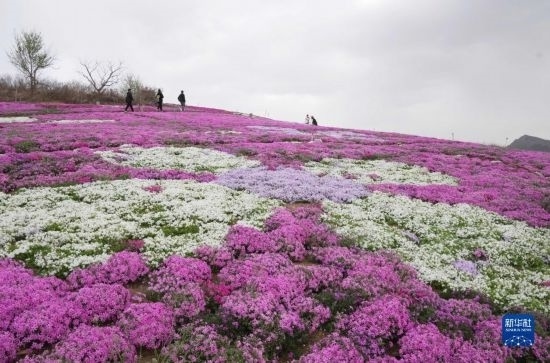 4月6日,游客在遷西縣大黑汀水庫(kù)東岸的芝櫻花海觀光。