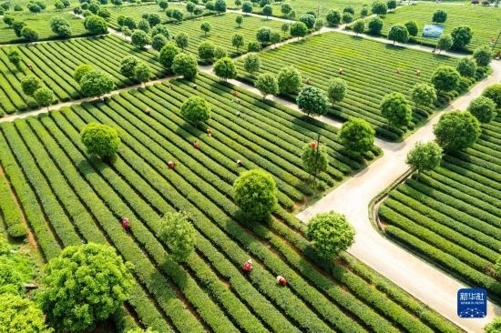 4月11日,在長(zhǎng)沙望城烏山貢茶基地,茶農(nóng)在采摘春茶(無(wú)人機(jī)照片)。