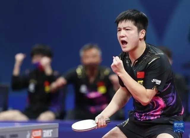 2022年10月9日,中國隊選手樊振東在比賽中慶祝得分,他以3:0戰(zhàn)勝德國隊選手貝內(nèi)迪克特·杜達(dá)。當(dāng)日,在成都世乒賽男團(tuán)決賽中,中國乒乓球男隊3:0戰(zhàn)勝德國隊。 新華社記者江宏景攝