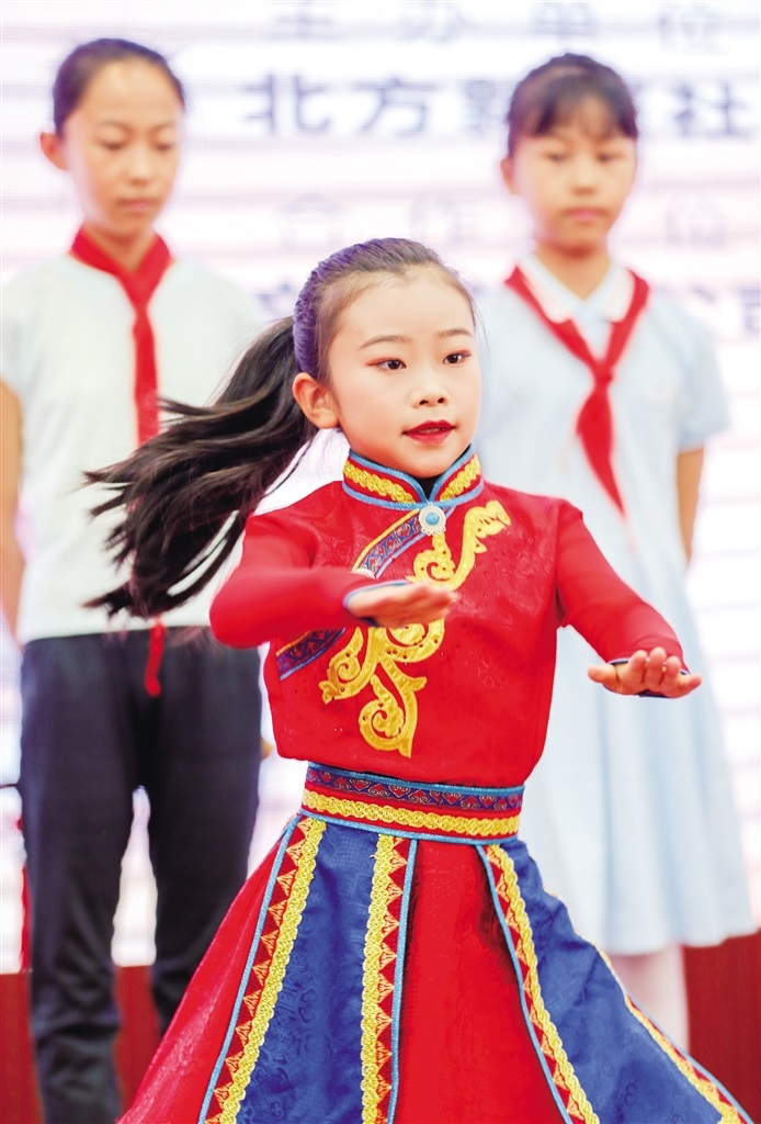 同樣來(lái)自騰飛路小學(xué)三年級(jí)5班的寧悅彤壓軸出場(chǎng),在舞臺(tái)上激情四射的啦啦操表演獲得了很高的分?jǐn)?shù)。就在前一天,她和她的小伙伴們代表學(xué)校參加呼和浩特市第六屆中小學(xué)啦啦操健美操大賽,捧回了團(tuán)體第一的驕人成績(jī)。寧悅彤在后臺(tái)接受記者采訪時(shí)說(shuō):“第一次站上這樣大的舞臺(tái)表演,起初有點(diǎn)緊張,有幾個(gè)動(dòng)作在表演過(guò)程中需要身體接觸地面,會(huì)很疼,但這是必須要承受的。我覺(jué)得這次經(jīng)歷也讓我更加勇敢,更加自信了?!?/p>