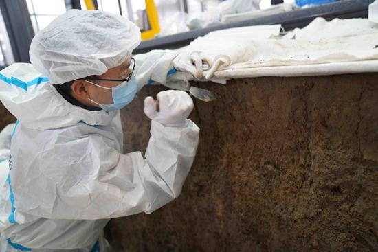 在三星堆遺址,考古發(fā)掘現(xiàn)場(chǎng)被大跨度鋼結(jié)構(gòu)大棚覆蓋,里面有數(shù)個(gè)“考古發(fā)掘艙”,不僅能控制溫度、濕度,還能減少工作人員從外界帶入的物質(zhì)干擾。而眼前的考古工作者,更像在實(shí)驗(yàn)室工作,穿著全副武裝的白色“防護(hù)服”,趴在“非接觸式裝置”上,懸在祭祀坑上方,拍照、清理……頗有科幻電影的即視感。