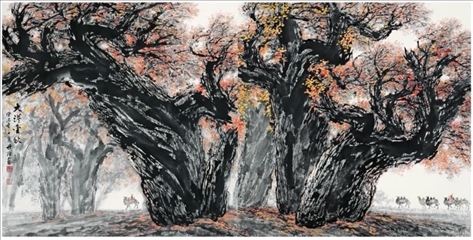 梁先生曾旅居西藏四個(gè)月,不僅為人民大會(huì)堂西藏廳創(chuàng)作了巨幅國畫《雪山雄鷹》,同時(shí)收獲了數(shù)百張速寫和寫生稿。他還四上黃山,兩次到三峽。2000年,70多歲的梁世雄又深入新疆無人區(qū)胡楊林中進(jìn)行素材收集。此后,大漠胡楊成了梁世雄作品新的視覺符號(hào)。