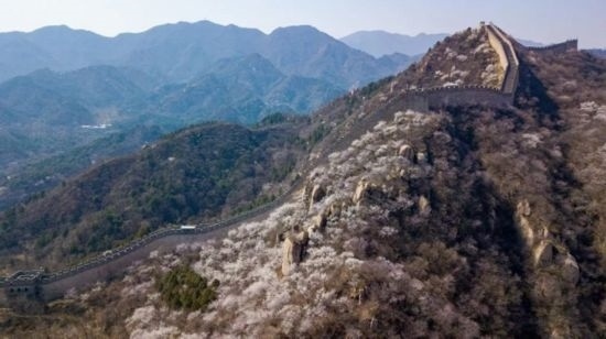 仲春時(shí)節(jié),八達(dá)嶺東段的水關(guān)長(zhǎng)城山花爛漫,自然與人文景觀交相輝映。(新華社發(fā)陳鐘昊 攝)