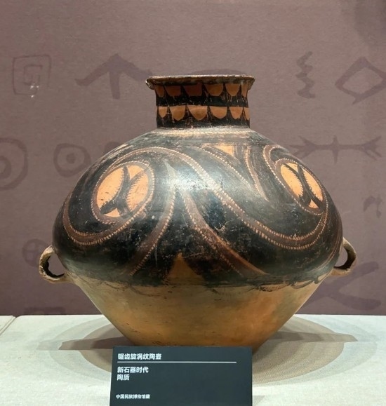 鋸齒旋渦紋陶壺 新石器時(shí)代 中國民族博物館藏。(民族畫報(bào)記者 鷹鴿 攝)