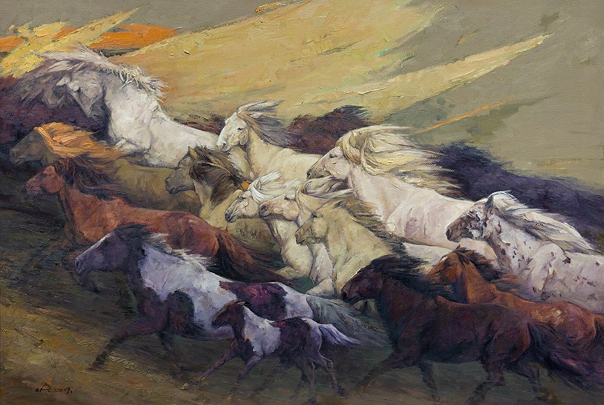 哈日巴拉油畫《逐夢前行蒙古馬》