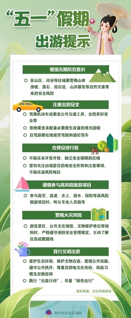 文化和旅游部近日發(fā)布“五一”假期出游提示,提醒廣大游客增強汛期防范意識、注重出游安全、合理安排行程、謹慎參與高風險旅游項目、警惕火災風險、踐行文明出游。