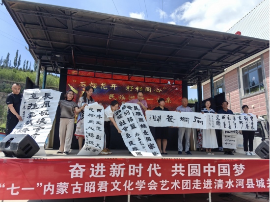 據(jù)了解,本次進(jìn)社區(qū)活動(dòng)由內(nèi)蒙古昭君文化學(xué)會(huì)、清水河縣城關(guān)鎮(zhèn)政府、昆新社區(qū)主辦,活動(dòng)以“鑄牢中華民族共同體意識(shí),構(gòu)筑中華民族共有精神家園”和慶祝中國(guó)共產(chǎn)黨建黨103周年為主旨,以書法、歌舞等群眾喜聞樂(lè)見的藝術(shù)形式,歌頌中國(guó)共產(chǎn)黨帶領(lǐng)全國(guó)各族人民守望相助、團(tuán)結(jié)奮斗砥礪前行的光輝歷程以及取得的偉大成就,真情詮釋不忘初心,牢記使命的責(zé)任擔(dān)當(dāng)。
