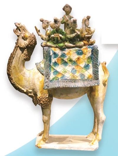 陜西歷史博物館藏三彩載樂駱駝俑,見證了文化藝術(shù)交融的歷史。一塊色彩斑斕的毛毯置于駝背之上,7名樂手手持不同樂器盤腿演奏,中間一女子正動情歌唱。一個(gè)“駝背上的樂隊(duì)”,再現(xiàn)了鮮活的盛唐長安,各地人們在此相遇,盡情演繹對美好生活的追求。